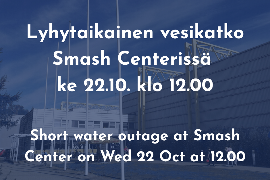 Lyhytaikainen vesikatko Smash Centerissä ke 22.10. klo 12.00. Katkoksen odotetaan kestävän vain muutaman minuutin, syynä vesimittarin vaihto. Short water outage at Smash Center on Wed 22 Oct at 12.00.…