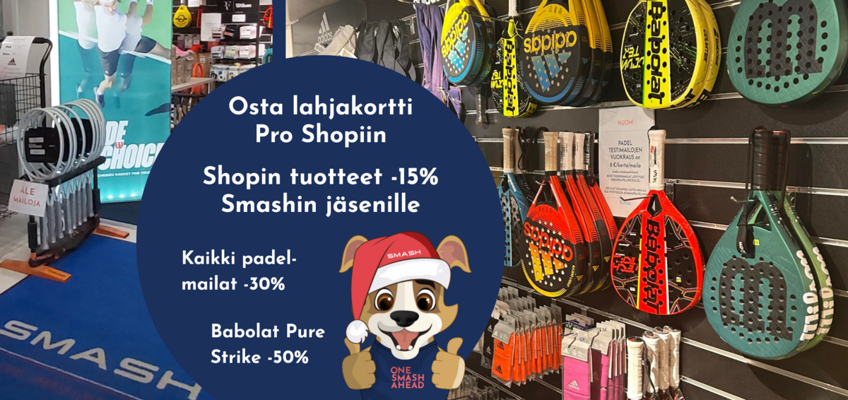 Smashin jäsenet saavat Pro Shopin vaatteista, mailoista, kengistä ja kasseista 15% alennuksen (ei koske jo valmiiksi alennettuja tuotteita kuten esimerkiksi sukkia, Smashin Adidas-seurapaitaa, shortseja ja hametta).