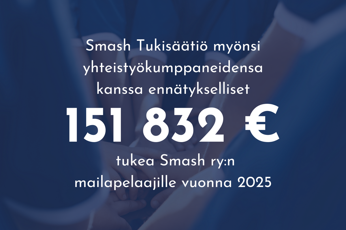 Vuonna 2025 Smash Tukisäätiö tuki mailapelaajia ennätyksellisellä 151 832,15 eurolla. Tuen määrä kasvoi yli 50 000 eurolla edellisvuoteen verrattuna, ja samalla rikottiin ensimmäistä kertaa 100 000 euron raja.