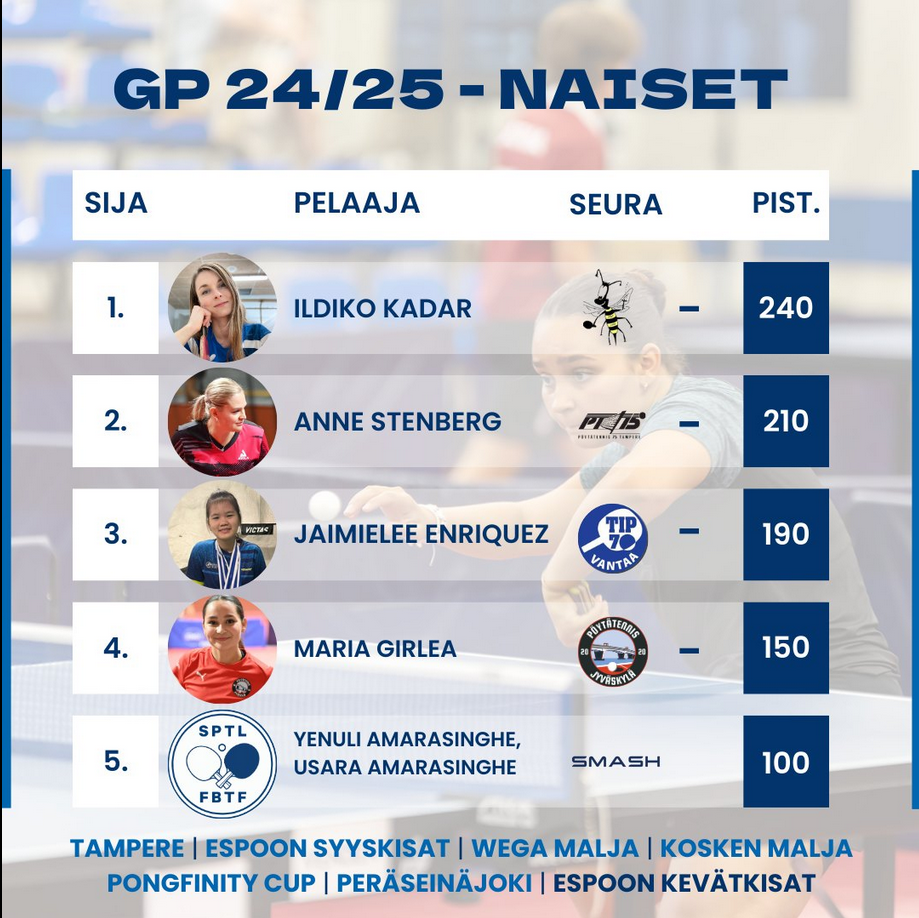 Kruunu vahvalle kaudelle tuli eilen, jolloin varmistui Smashin historiallinen voitto seurojen välisessä GP-sarjassa. Suomen Pöytätennisliiton GP-sarja on kotimaisille huippupelaajille suunnattu kilpailusarja. GP-sarjan paremmuudesta pelataan miehissä, naisissa ja junioriluokissa sarjoissa U18 tytöt ja pojat sekä U14 tytöt sekä pojat.