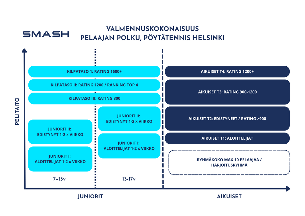 Smashin juniorien pöytätennisvalmennus on suunnattu 7–17-vuotiaille lapsille ja nuorille. Toiminnassamme on mukana pöytätenniksen pariin vasta löytäneitä sekä ikäluokkansa Suomen huippuja.