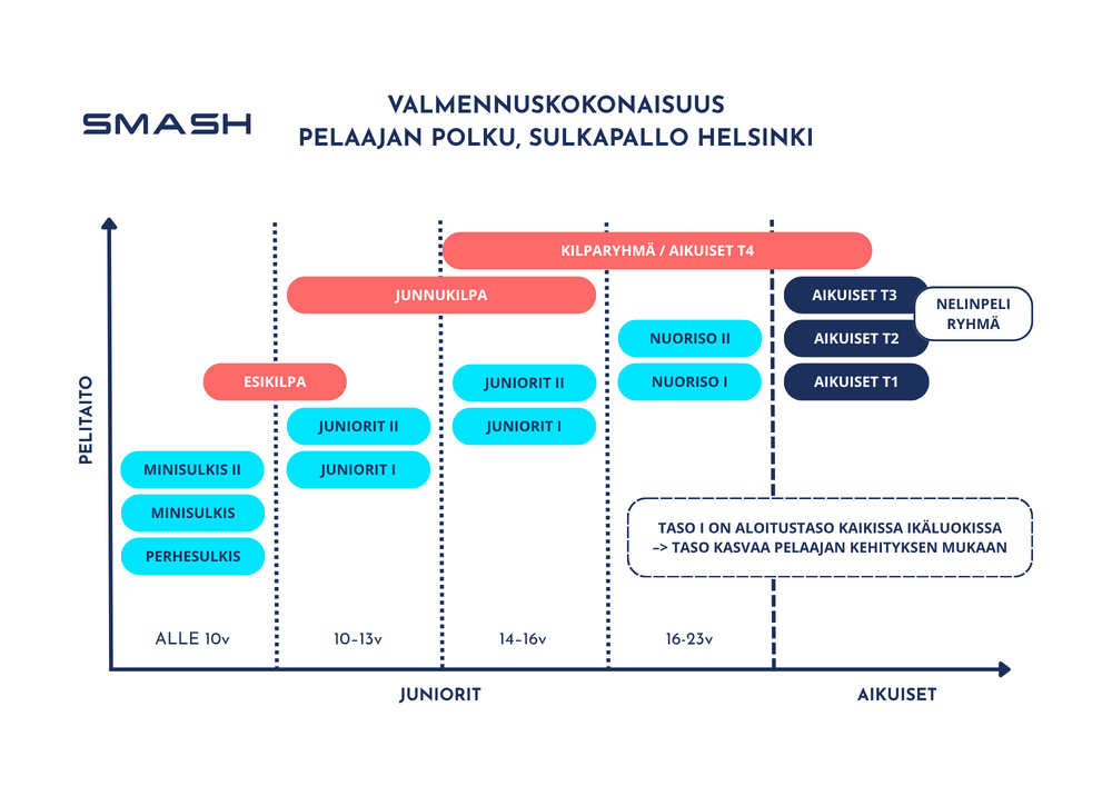 Smashin sulkapallon valmennuskokonaisuus (kts. kuva yllä) koostuu aikuisilla neljästä erilaisesta tasosta harrastaa ja kehittää sulkapallotaitoja.