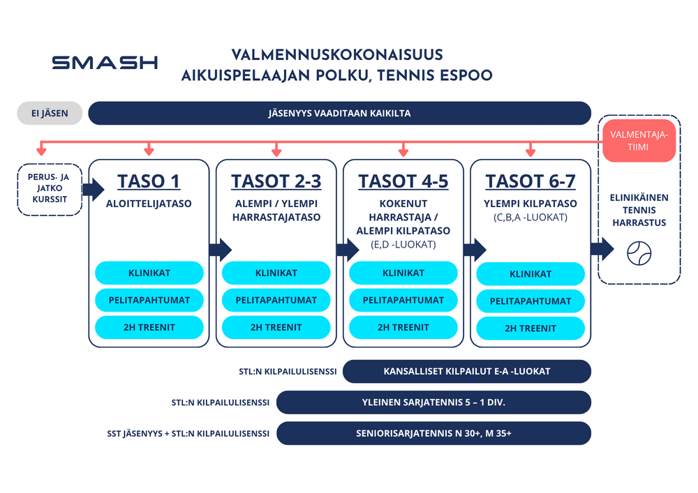 Valmennukseen haetaan TennisClub -järjestelmän valmennushakulomakkeella "Syksy 2026 → Tennis, Aikuisvalmennus, Espoo [haku pelaajille, jotka ovat mukana Smashin valmennuksessa kevätkaudella 2026.]"